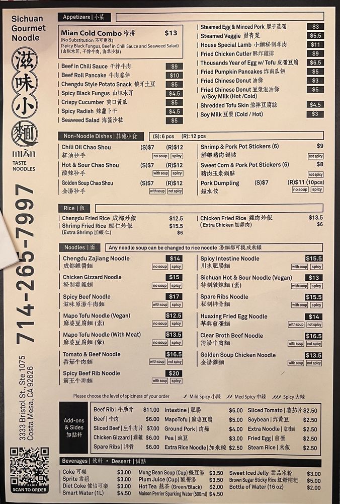 Welcome to Mian Sichuan Gourmet Noodles, where authentic Chinese flavors come to life in the heart of Costa Mesa. This culinary gem offers a diverse menu that highlights the art of Sichuan cuisine, particularly their delectable noodle dishes. From the Chengdu Zajiang Noodles to the rich Spicy Beef Rib Soup Noodles, each option promises an explosion of flavors that will tantalize your taste buds.